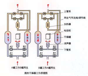 利用变压吸附,再生循环,使压缩空气交替流经A、B两个充满吸附剂的干燥罐,即一个罐体在高分压(工作压力)状态下吸附水蒸汽时,另一个罐体在低分压(接近大气压)下解析,然后按设定的时间程序切换。 |